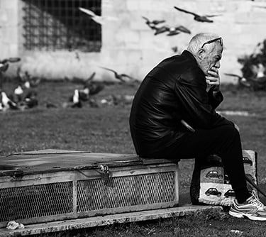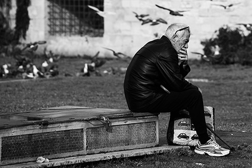 Deep in thought, warmed by watery December sunlight in a park in southern Italy, a local finds a perch among the pigeons in Lecce.