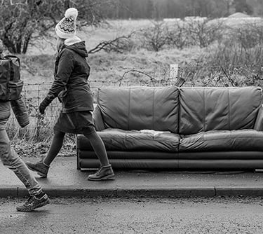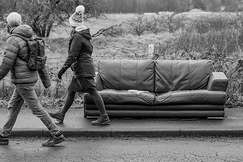 Another dog walk related image. I've always wanted to take a picture of a housebound object outwith it's normal context. So a dumped sofa next to a field was too good to pass by (although we could discuss how 'outwith normal' old furniture in the suburban countryside really is...). I hadn't seen anyone actually sit on this piece: likely too soggy with springs in the wrong places 'n all. But it was left on the flat section of an otherwise steep-ish hill, so some passing walker may have been grateful of a perch while they got their breath back.